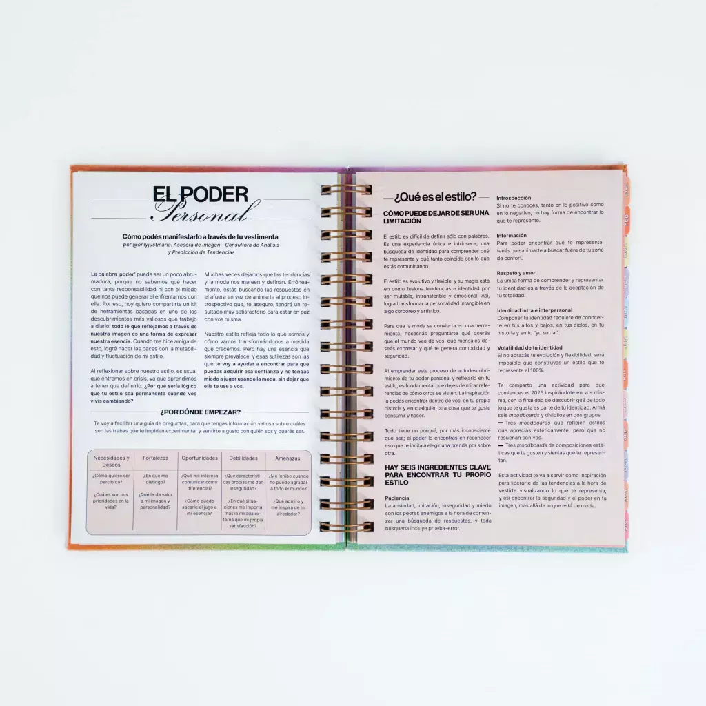 Con un formato semanal a color y tamaño A5 (15x21 cm), cuenta con 244 páginas que incluyen planificadores anuales y mensuales, habit tracker, y espacios para balancear el 2025 y proyectar tu 2026. Además, trae señalador imantado, stickers y un sobre de guardado PVC.