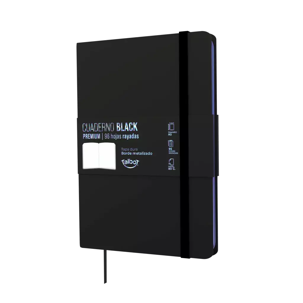 Cuaderno A5 Talbot - Black. Sus 96 hojas rayadas incluye elástico y señalador que facilitan su uso diario.